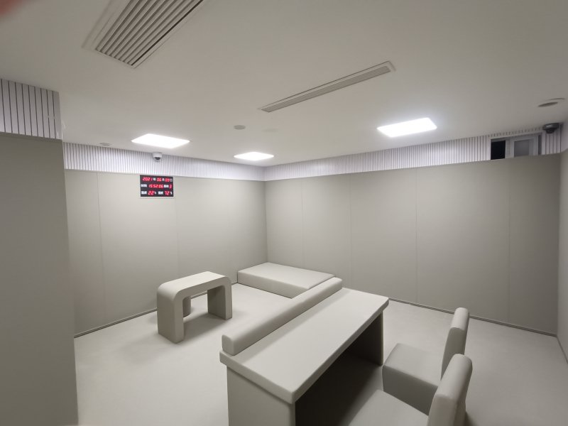 紀檢監(jiān)察談話室配置主要是整體墻面軟包防撞:采用聚乙稀防撞軟包為主體,配合踢腳線、中線、收邊條、上收口條進行建設墻面軟包防撞安裝;使用規(guī)格為1250*2450mm的尺寸,厚度選用20mm或30mm;顏色選用淺灰色,耐臟易清洗;為安全著想,選用的軟包全部是達到阻燃B1級,環(huán)保E0級的材料。還要在考慮到談話室需要錄音等,室內要很好的吸音降噪效果,所以常規(guī)都會在墻面高于2.45米以上的地方可以用紅芯阻燃木質吸音板進行安裝,達到整體留置室的吸音降噪效果,從而確保談話室的錄音質量。